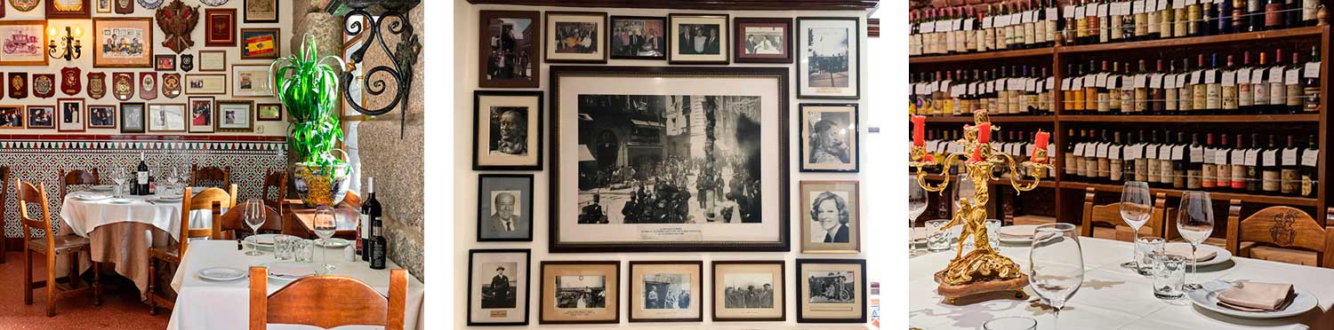 Los comedores, que aparecen ahora luminosos y despojados de sus viejos cortinajes, se encuentran articulados a través de una cocina abierta que muestra las entrañas de la vieja taberna. Las paredes son una miscelánea de imágenes dispuestas por temáticas: la tauromaquia, el regicidio frustrado, las celebridades y, al fondo, el Salón Real, en el que se suceden los recuerdos monárquicos y gran variedad de efectos militares, todo ello bajo la atenta mirada del Apóstol Santiago que, esculpido en piedra, preside la escena. No en vano, Casa Ciriaco, que también alberga dos cuevas de enorme interés, es un lugar de peregrinaje donde, muy probablemente, los parroquianos alcanzan, antes o después, algún tipo de ‘indulgencia plenaria’.